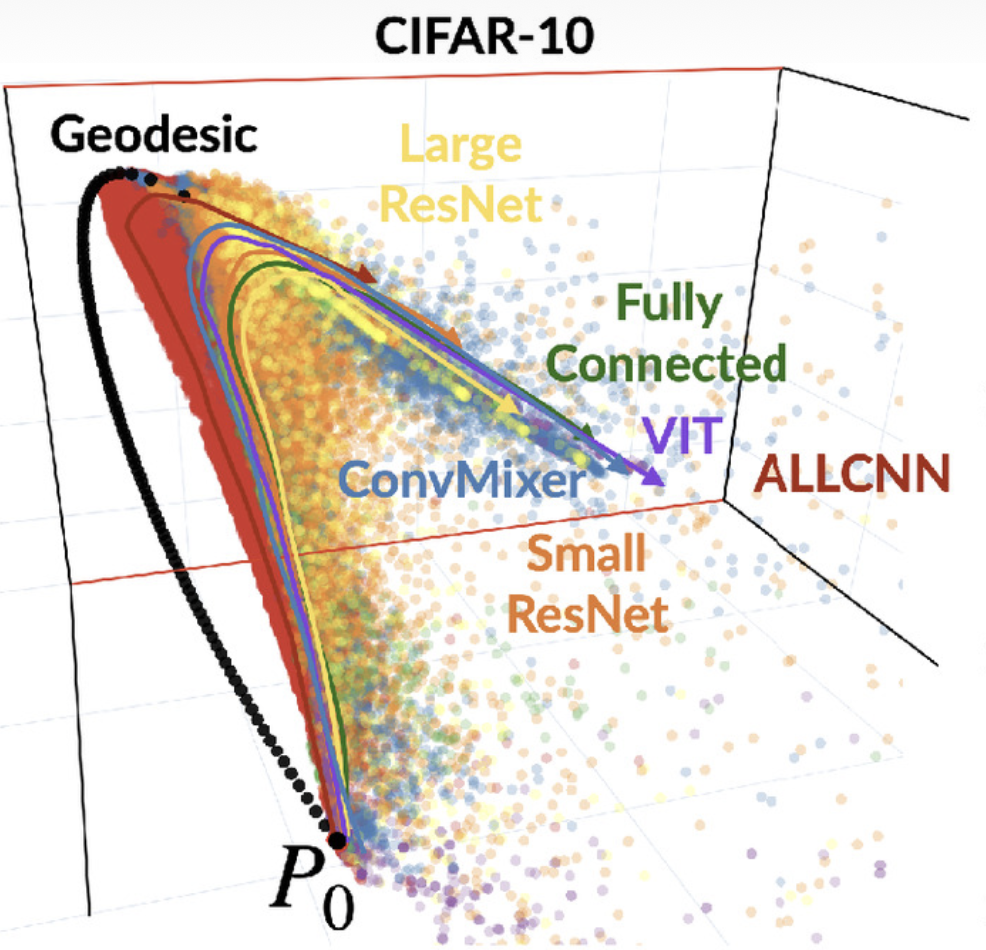As an example of this sort of work, recent research has combined large-scale data analysis with sophisticated mathematical methods to investigate how large neural networks learn during training, concluding that the training process of many deep networks explores the same low-dimensional manifold, as summarized in the figure below.