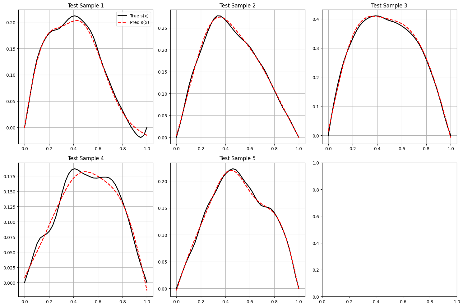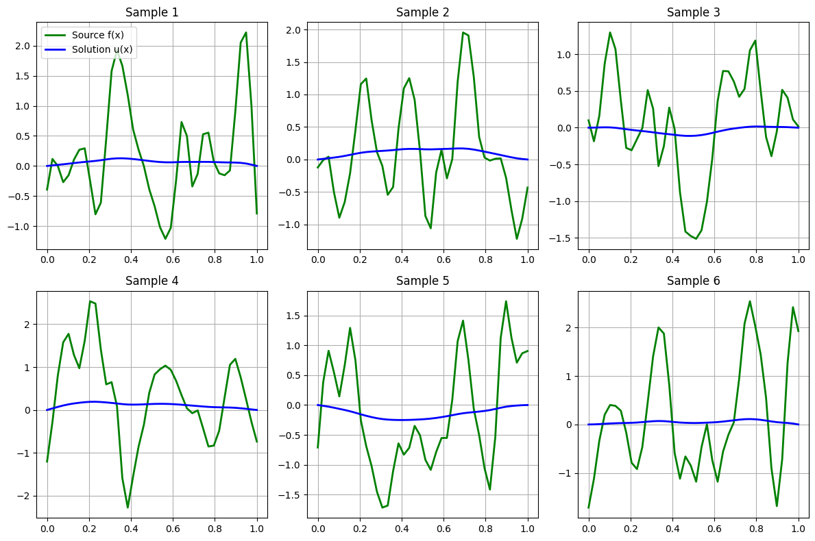f(x)is a Gaussian random field defined asf(x) ~ GP(0, k(x, x'))such thatk(x, x') = σ² exp(-||x - x'||² / (2ℓ_x²)), whereℓ_x = 0.04andσ² = 1.0. - Homogeneous Dirichlet boundary conditions
