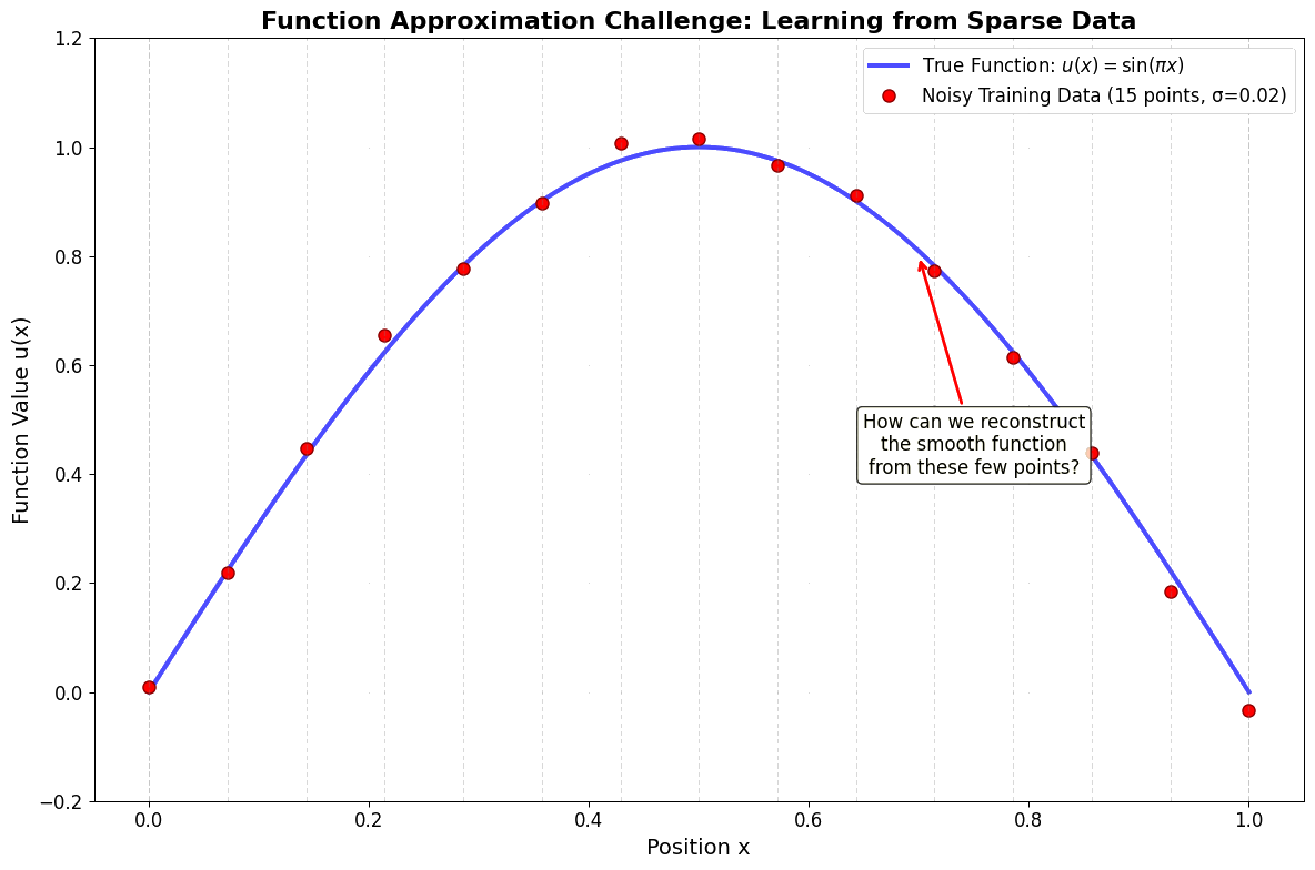 Consider this question: Can we learn to approximate \(u(x) = \sin(\pi x)\) by observing only sparse data points?