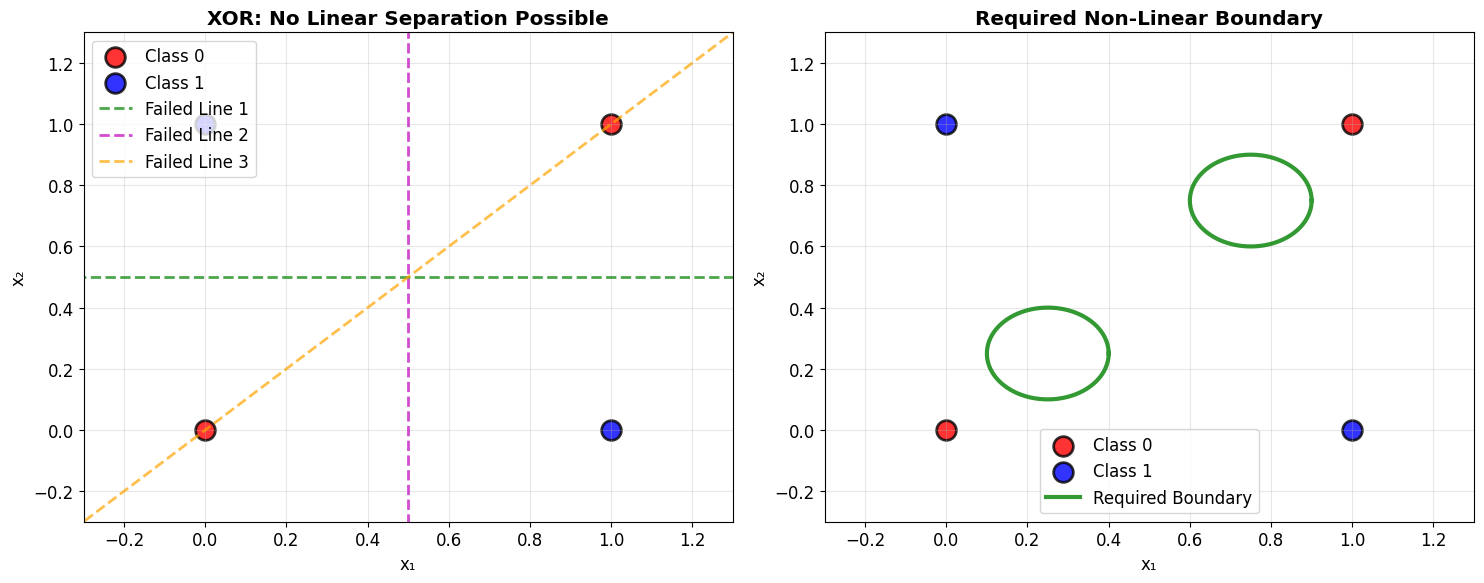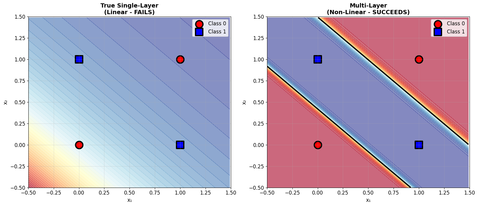 The XOR problem exposed fundamental limitations of true single-layer perceptrons, causing the 'AI winter' of the 1970s. This simple problem reveals why depth is essential.