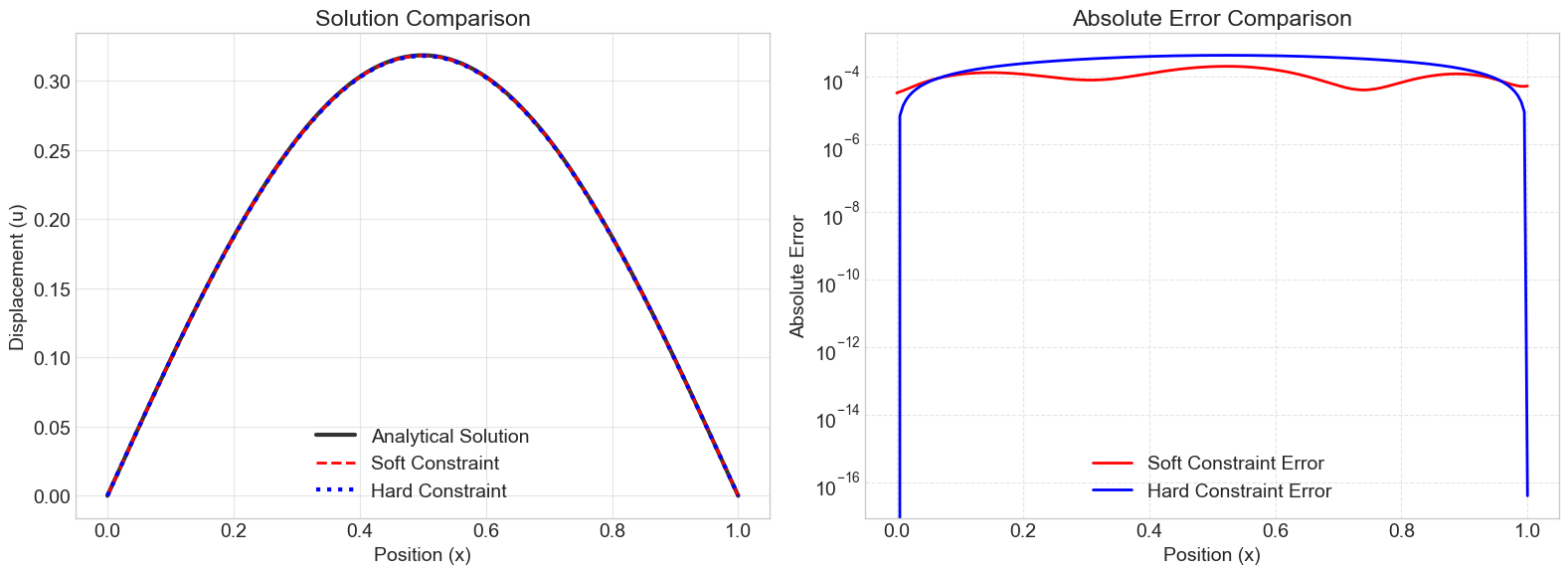 Both methods achieve a high degree of accuracy for this problem. The hard constraint method shows a slightly lower overall error (RMSE) and, by design, has zero error at the boundaries.