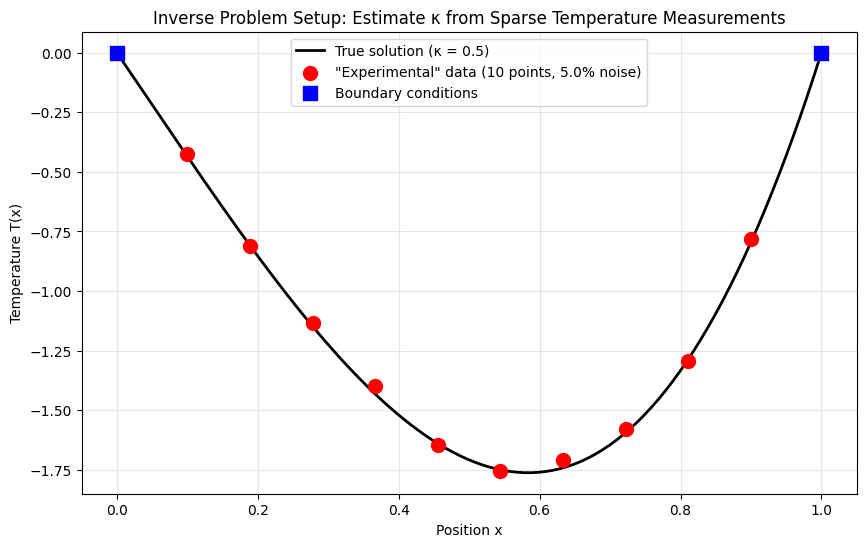 In a real experiment, we would measure temperature at a few locations. Let's simulate this with sparse, noisy measurements.