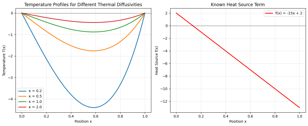 Notice how \( T(x) \) depends on \( \kappa \). Different values of \( \kappa \) give different temperature profiles!