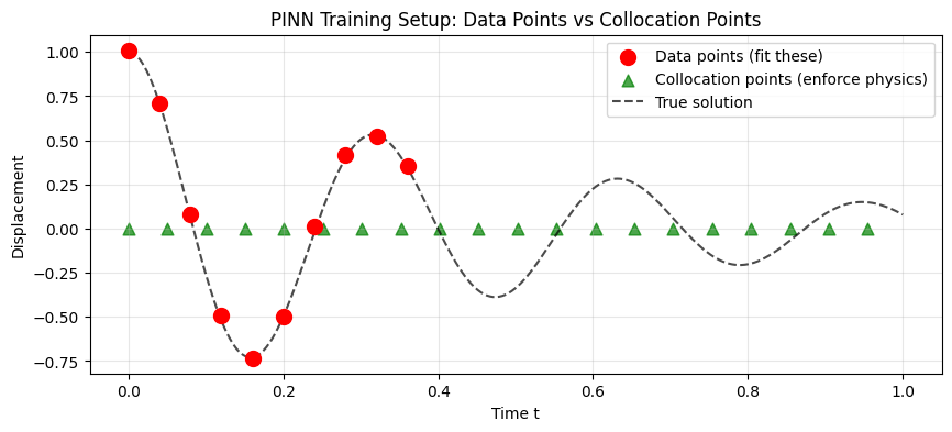 - Collocation points: Where we enforce physics (not necessarily data points)